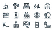 ikony miejskiej linii życia. zestaw liniowy. wysokiej jakości zestaw linii wektorowych, takich jak fontanna, schody, reklamy, rower, marionetka, bank, film, światła drogowe, wc