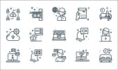 ikony linii domowej. zestaw liniowy. zestaw linii wektorowych jakości, takich jak odtwarzacz wideo, zadanie, sprzężenie zwrotne, kamerka internetowa, pracownik biurowy, komunikacja, udostępnianie plików, pracownik, pracownik biurowy