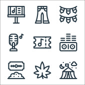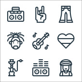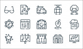 ikony linii muzycznej. zestaw liniowy. wysokiej jakości zestaw linii wektorowych, takich jak mikrofon, gniazdo audio, dysk, djembe, klarnet, bęben, flet, conga