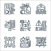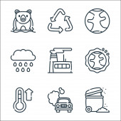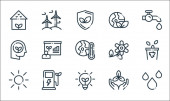 ikony linii zmian klimatycznych. zestaw liniowy. wysokiej jakości zestaw linii wektorowych, takich jak ziemia, elektrownia, wulkan, globalne ocieplenie, śmieci, płatki śniegu, płonące drzewo, tsunami