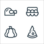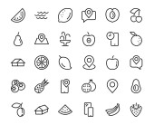 ikony linii urządzeń krajobrazowych. zestaw liniowy. wysokiej jakości zestaw linii wektorowych, takich jak jabłko, siekiera, ogrodnik, gruszka, pomarańcza, chili, garnek, grabie
