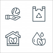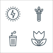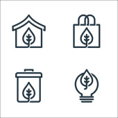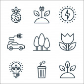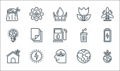 ikony linii ekologicznej. zestaw liniowy. wysokiej jakości zestaw linii wektorowych, takich jak bańka mowy, probówka, panele słoneczne, liść roślin, dom, kropla wody, ładowanie baterii