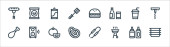 ikony płaskiej linii grilla. zestaw liniowy. wysokiej jakości zestaw linii wektorowych, takich jak butelka sosu, szpikulec, krewetki, zacisk, burger, przyprawa, kiełbasa, rękawica