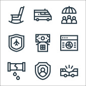 ikony linii ubezpieczeniowej. zestaw liniowy. zestaw linii wektorowych jakości, takich jak uraz, pieniądze, tarcza, uszkodzony rura, ubezpieczenie, pieniądze, tarcza, wypadek samochodowy