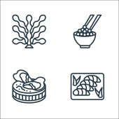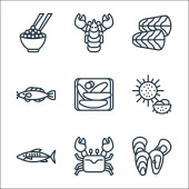 ikony linii owoców morza. zestaw liniowy. wysokiej jakości zestaw linii wektorowych, takich jak pizza, homar, sashimi, ryby, makaron, wodorosty, ostrygi, meduzy