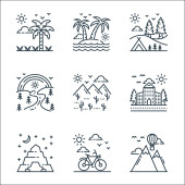 ikony linii turystycznych. zestaw liniowy. wysokiej jakości zestaw linii wektorowych, takich jak świątynia, camper van, wyspa, diabelski młyn, wieża, domek, kolejka linowa, brama torii