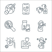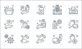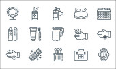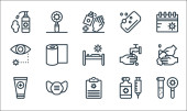 myć ręce ikony linii. zestaw liniowy. wysokiej jakości zestaw linii wektorowych, takich jak brud, dezynfektor rąk, mydło, szpital, bibuła, dezynfektor rąk, raport medyczny, pranie ręczne, spray czyszczący