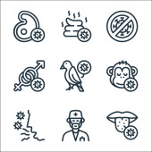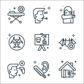ikony linii wirusa objawów. zestaw liniowy. wysokiej jakości zestaw linii wektorowych, takich jak kaszel, oddech, pobyt w domu, ból gardła, ti, zachować dystans, leki, chory