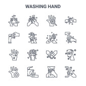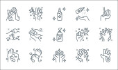 ikony mycia rąk. zestaw liniowy. wysokiej jakości zestaw linii wektorowych, takich jak czyszczenie, pranie ręczne, ręcznik, płyn czyszczący, płyn czyszczący, płyn, bibuła, higieniczne