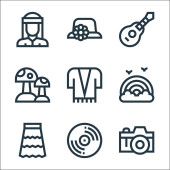 ikony brazylijskiego karnawału. zestaw liniowy. wysokiej jakości zestaw linii wektorowych, takich jak plaża, trąbka, kokos, muzyka, maska, gitara, aparat fotograficzny, mapa