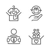 ikony linii charytatywnej. zestaw liniowy. zestaw linii wektorowych jakości, takich jak apteczka pierwszej pomocy, jałmużna, równość, schronienie, kobieta, wsparcie, darowizna, sieć