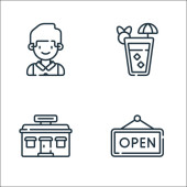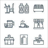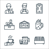 ikony linii barów. zestaw liniowy. wysokiej jakości zestaw linii wektorowych, takich jak otwarte, papieros, nóż, vip, filiżanka herbaty, ekspres do kawy, rachunek, mojito