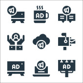 ikony linii reklamowej. zestaw liniowy. wysokiej jakości zestaw linii wektorowych, takich jak widok, billboard, wartość, merchandising, skrzynka pocztowa, kamera, strona internetowa, moneta, czat mobilny