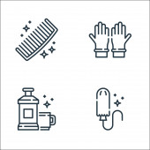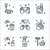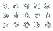 ikony linii higienicznych. zestaw liniowy. wysokiej jakości zestaw linii wektorowych, takich jak środek dezynfekujący, śmieci, pranie ręczne, klucze, ręka, ręcznik papierowy, ręce, apteka, sprzątanie