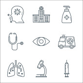 zatrzymać ikony linii wirusów. zestaw liniowy. wysokiej jakości zestaw linii wektorowych, takich jak probówka, lekarz, ochrona twarzy, ból gardła, dezynfektor, oddychanie, autobus, probówka