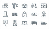 ikony logistyczne i linii dostaw. zestaw liniowy. wysokiej jakości zestaw linii wektorowych, takich jak waga, ramię robota, dostawca, dźwig, lokalizacja, wózek widłowy, paczka, na całym świecie, kontener