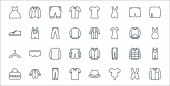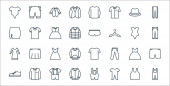 ikony linii garderoby. zestaw liniowy. wysokiej jakości zestaw linii wektorowych, takich jak smoking, mundur, but, spódnica, krótki, mundur, kurtka zimowa, wieszak, spodnie