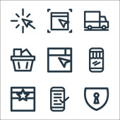 ikony płaskiej linii e-commerce. zestaw liniowy. zestaw linii wektorowych jakości, takich jak wywołanie, wyszukiwanie, powrót, wybierz, zablokowanie, dodaj do koszyka, sklep internetowy, strzałka