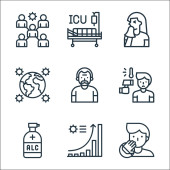 ikony linii koronawirusów. zestaw liniowy. wysokiej jakości zestaw linii wektorowych, takich jak probówka, ból głowy, naukowiec, przenoszenie wirusa, uścisk dłoni, sanitariusz, kaszel, szczepienie