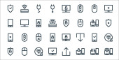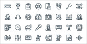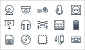 ikony linii multimedialnych. zestaw liniowy. wysokiej jakości zestaw linii wektorowych, takich jak drukarka, wyszukiwanie, monitor komputera, wysyłanie, udostępnianie, wideo, tasowanie, laptop, słuchawki