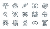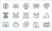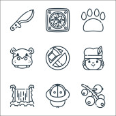 ikony linii dżungli. zestaw liniowy. wysokiej jakości zestaw linii wektorowych, takich jak chata, bez cięcia, kwiat, hipopotam, dziewczyna, aligator, pantera, kompas, góra