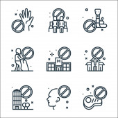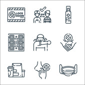 ikony linii ograniczeń wirusów. zestaw liniowy. wysokiej jakości zestaw linii wektorowych, takich jak bez dotyku, bez podróży, bez dotyku, grobowiec, węże, starzec, kościół, mięso
