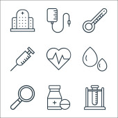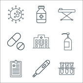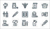 ikony linii narzędzi medycznych. zestaw liniowy. zestaw wysokiej jakości linii wektorowych, takich jak wynik medyczny, opieka zdrowotna, apteka, lek, ciśnieniomierz, syrop, infuzja, kolba