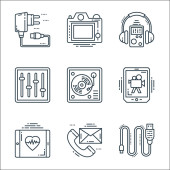 ikony linii urządzeń technologicznych. zestaw liniowy. wysokiej jakości zestaw linii wektorowych, takich jak chłodnica powietrza, odtwarzacz muzyczny, radio vintage, kamera wideo, przedłużacz, lampa sypialna, kamera cctv, kuchenka ciśnieniowa