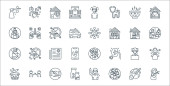 ikony linii dezynfekcji masowej. zestaw liniowy. wysokiej jakości zestaw linii wektorowych, takich jak łóżka, samolot, buty, dom, dron, hotele, prysznic, pogrzeb, ziemia