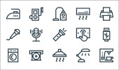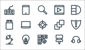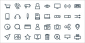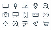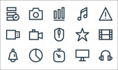 ikony linii multimedialnych. zestaw liniowy. wysokiej jakości zestaw linii wektorowych, takich jak zapisać, deska, dom, grać, wysłać, koszyk, dźwięk, kamera wideo, kalendarz