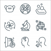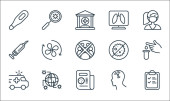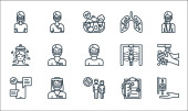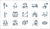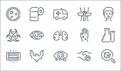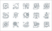 zatrzymać ikony linii wirusów. zestaw liniowy. wysokiej jakości zestaw linii wektorowych, takich jak temperatura, okno, odległość, wentylator, płuca, schowek, kroplomierz, koronawirus, oko