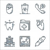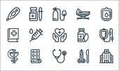 ikony linii narzędzi medycznych. zestaw liniowy. wysokiej jakości zestaw linii wektorowych, takich jak bandaż, wezwanie pomocy, elektrokardiogram, dentysta, ambulans, zaprawa, ziołowa, probówka, poczekalnia