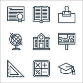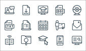 ikony linii nauki online. zestaw liniowy. zestaw linii wektorowych jakości, takich jak klawiatura, pasek wyszukiwania, informacje, chemia, kamerki internetowe, egzamin, lokalizacja, kalendarz