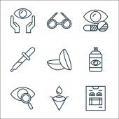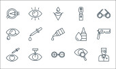 ikony linii okulistycznej. zestaw liniowy. wysokiej jakości zestaw linii wektorowych, takich jak kroplomierz do oczu, okulista, pielęgnacja oczu, test wzroku, cel, płacz, okulary testowe, chirurgia laserowa, ubezpieczenie oczu