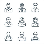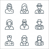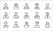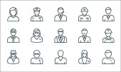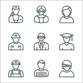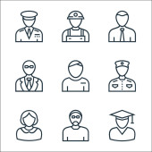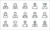 ikony zawodów. zestaw liniowy. zestaw linii wektorowych jakości, takich jak absolwent, pielęgniarka, prawnik, farmaceuta, zakonnica, pracownik, policjant
