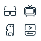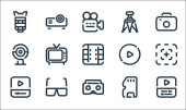 ikony linii wideo. zestaw liniowy. wysokiej jakości zestaw linii wektorowych, takich jak kamera wideo, karta pamięci, okulary d, migawka, taśma, film, obiektyw, projektor, statyw