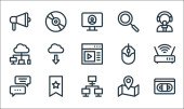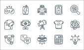 ikony mediów społecznościowych. zestaw liniowy. jakość wektor linii zestaw, takich jak monitor, kciuki do góry, profil, zaskoczony, sieć, laptop, podcast, recenzja, aktualności