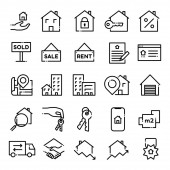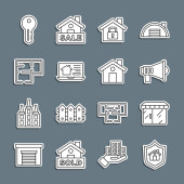 ikony linii nieruchomości. zestaw liniowy. jakość wektor linii zestaw, takich jak cel, kupić, sprzedawane, certyfikowany, winda, cctv, faktura, dom, klucz