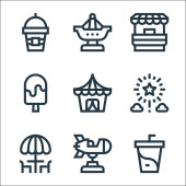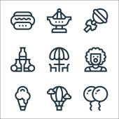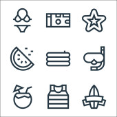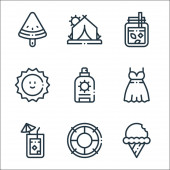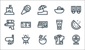 ikony sezonu letniego. zestaw liniowy. wysokiej jakości zestaw linii wektorowych, takich jak latarnia morska, herbata cytrynowa, muszla, piłka, obóz, pocztówka, krem z filtrem, arbuz