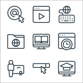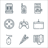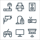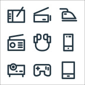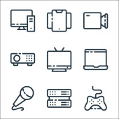 ikony linii elektroniki. zestaw liniowy. wysokiej jakości zestaw linii wektorowych, takich jak suszarka do włosów, smartfon, odtwarzacz muzyczny, klimatyzator, telewizor, pulpit, klawiatura fortepianu, pilot zdalnego sterowania