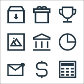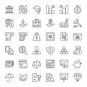 ikony linii bankowych i finansowych. zestaw liniowy. wysokiej jakości zestaw linii wektorowych, takich jak pos terminal, parasol, bank, stos złota, wykres wzrostu, zamek, kamera cctv, pos terminal