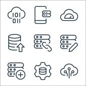 ikony linii serwerów biurowych. zestaw liniowy. zestaw linii wektorowych jakości, takich jak link, transfer danych, blok, eksport, pobieranie, zła recenzja, dane, serwer, dodać