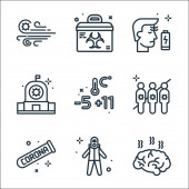 ikony linii pandemii płaskiego wirusa covid. zestaw liniowy. wysokiej jakości zestaw linii wektorowych, takich jak gorączka, nie dotykać, szczepionka, kichanie, stetoskop, kaszel, podróże, osoby starsze, środek dezynfekujący