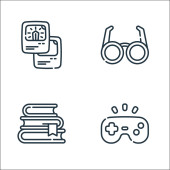 Zostań w ikonach domowej linii. zestaw liniowy. wysokiej jakości zestaw linii wektorowych, takich jak domino, roślin, bankowość online, herbata, gry wideo, wideo, relaks, dostawy żywności