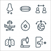 ikony linii przesyłu wirusa. zestaw liniowy. wysokiej jakości zestaw linii wektorowych, takich jak termometr, maska medyczna, pin lokalizacji