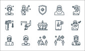 ikony linii przesyłu wirusa. zestaw liniowy. zestaw linii wektorowych jakości, takich jak unikanie tłumów, termometr, wirus, śmierć, wirus, szpital, maska medyczna, pin lokalizacji