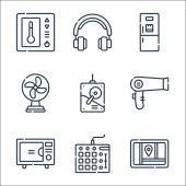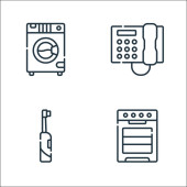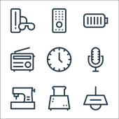 ikony linii elektroniki. zestaw liniowy. wysokiej jakości zestaw linii wektorowych, takich jak lampa biurkowa, ebook, kalkulator, pralka, odkurzacz, tv, klimatyzacja, konsola
