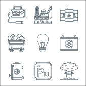 ikony linii energii jądrowej. zestaw liniowy. zestaw przewodów wektorowych jakości, takich jak dozymetr, paliwo gazowe, skan ct, atom, pocisk rakietowy, granat, promieniowanie, paliwo
