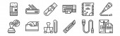 ikony linii papeterii. zestaw liniowy. wysokiej jakości zestaw linii wektorowych, takich jak drukarka, temperówka, rura lakiernicza, pędzel do farb, dysk twardy, linijka, notatka, frez