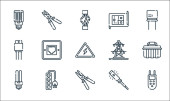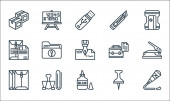 ikony linii papeterii. zestaw liniowy. wysokiej jakości zestaw linii wektorowych, takich jak pudełko, kabel USB, tablica, znaczek, linijka, klej, pióro, pędzel lakierniczy
